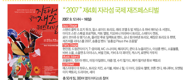 제 5회 자라섬 페스티발.~!9월12~16일 페이지 정보 작성자 뜰안채 작성일08-05-29 00:08 조회13,026회 댓글0건 본문 드디어.. 페스티발의 계절입니다.. 댓글목록 등록된 댓글이 없습니다. 이전글 다음글 목록