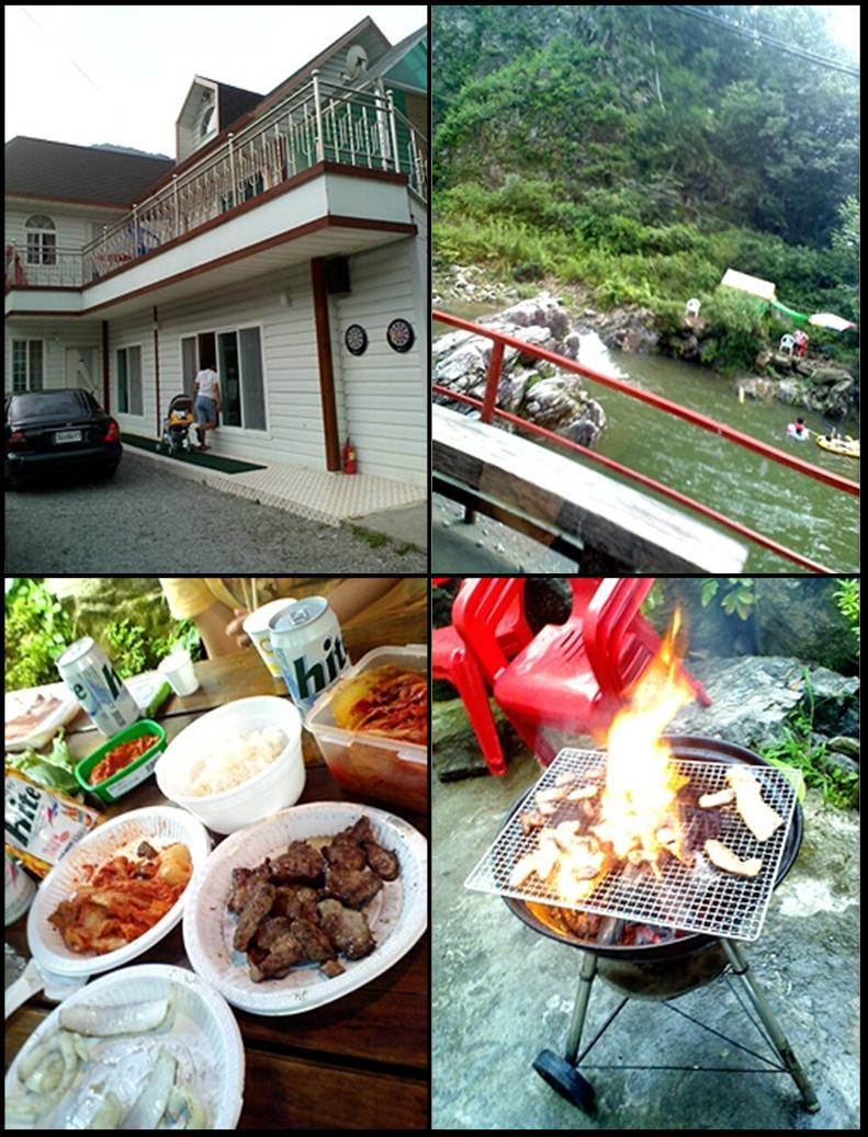 들어와서 씻고 저녁엔 계곡과 산이 보이는 앞마당에서 고기 구워먹고